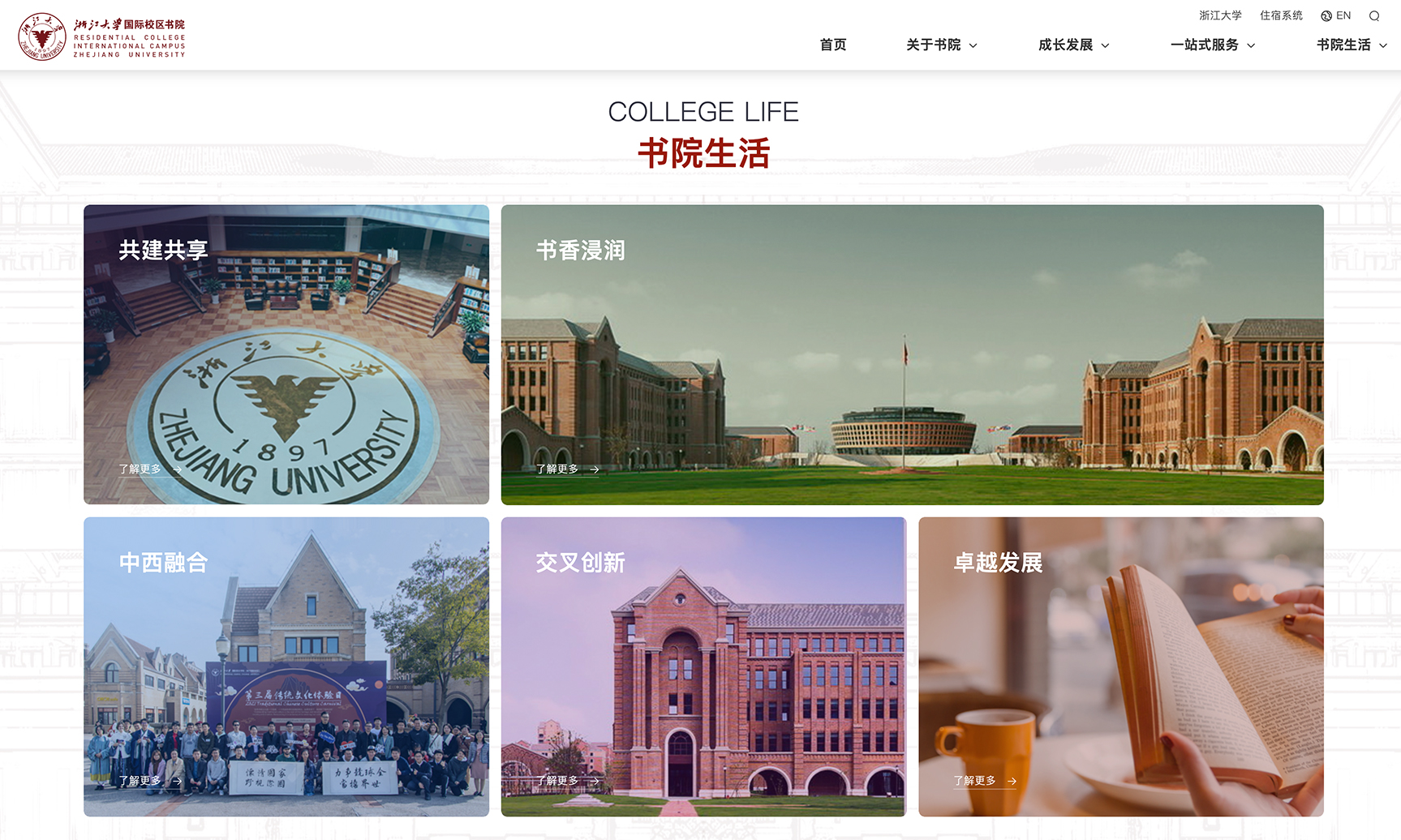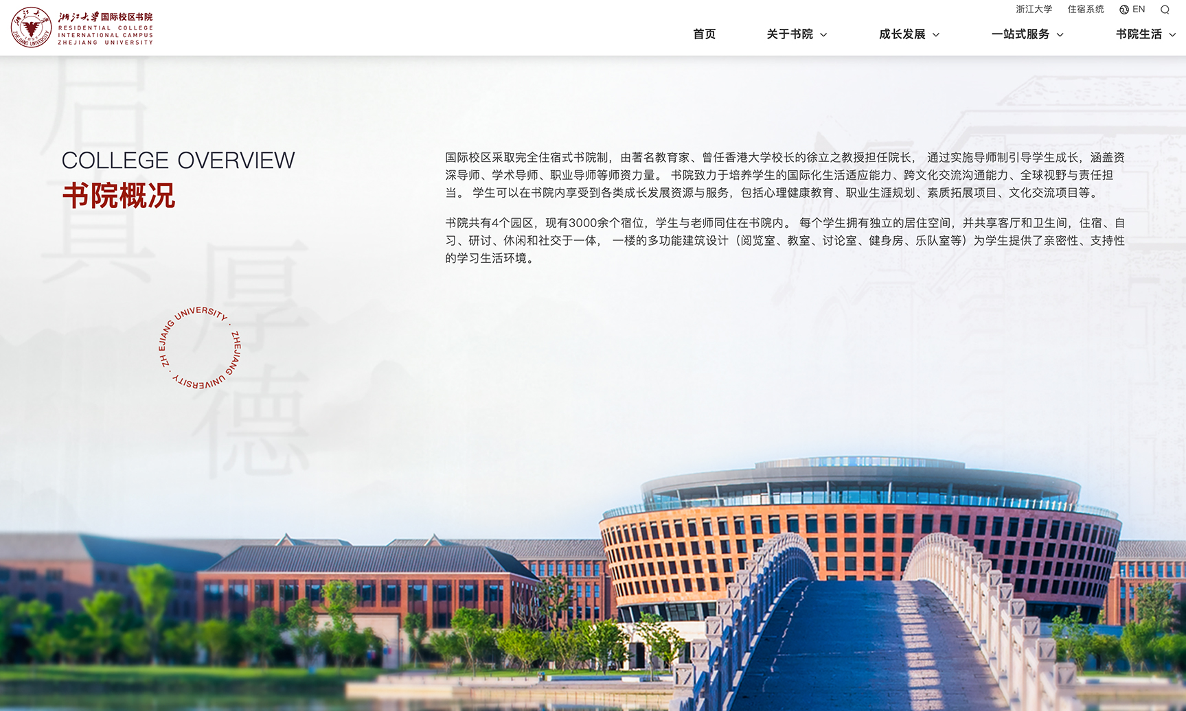 浙江大学国际校区采取完全住宿式书院制,致力于打造中外趋同管理、师生共同居住,集学习、住宿、休闲、社交于一体的国际化生活社区。由著名教育家、曾任香港大学校长的徐立之教授担任书院院长,建立有书香沁人Scholarship、交叉创新Helix、中西融合Integration、导师引领Navigation、卓越发展Excellence——SHINE育人平台。